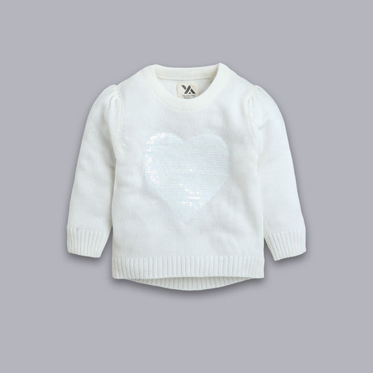 Girls Solid Round Neck White Sweater