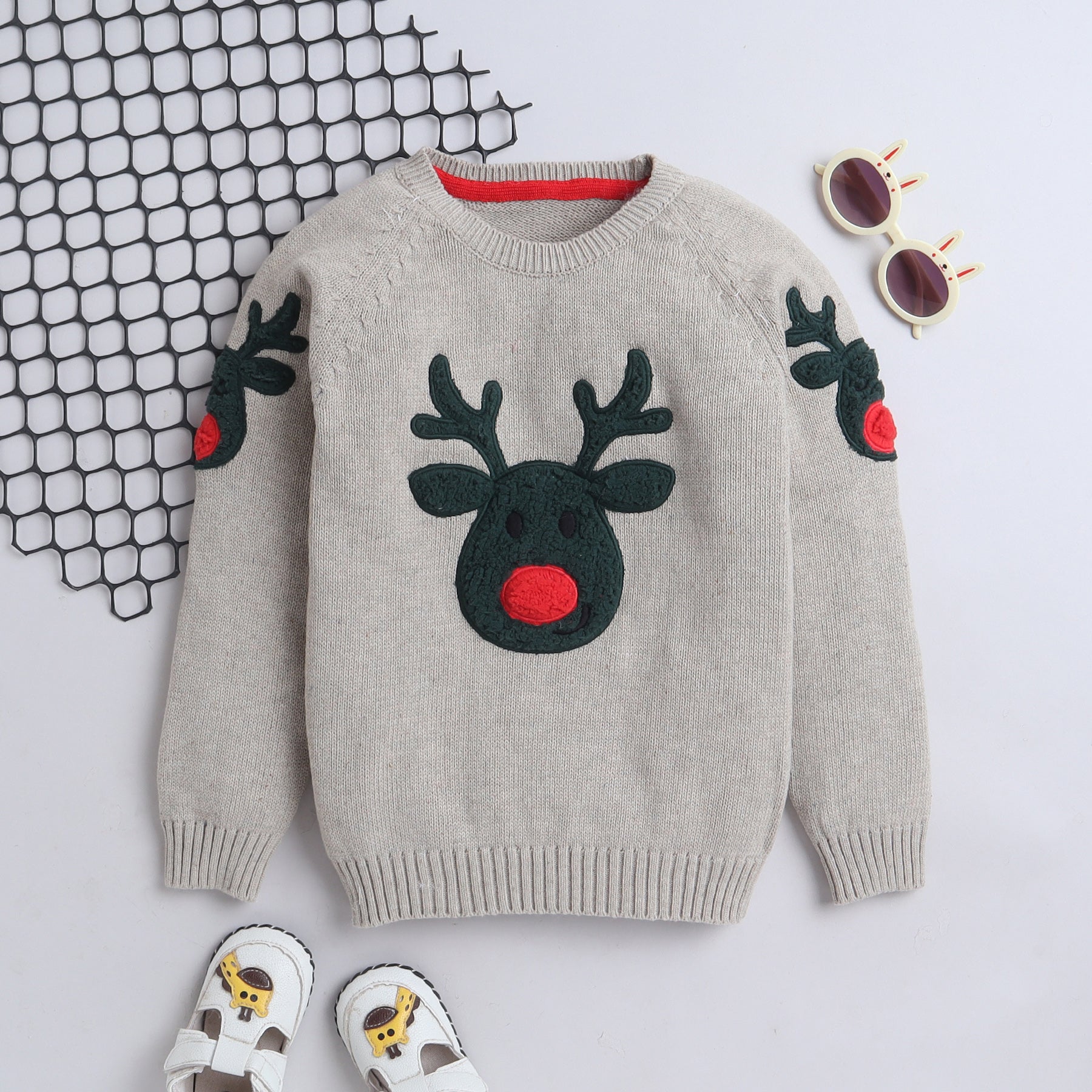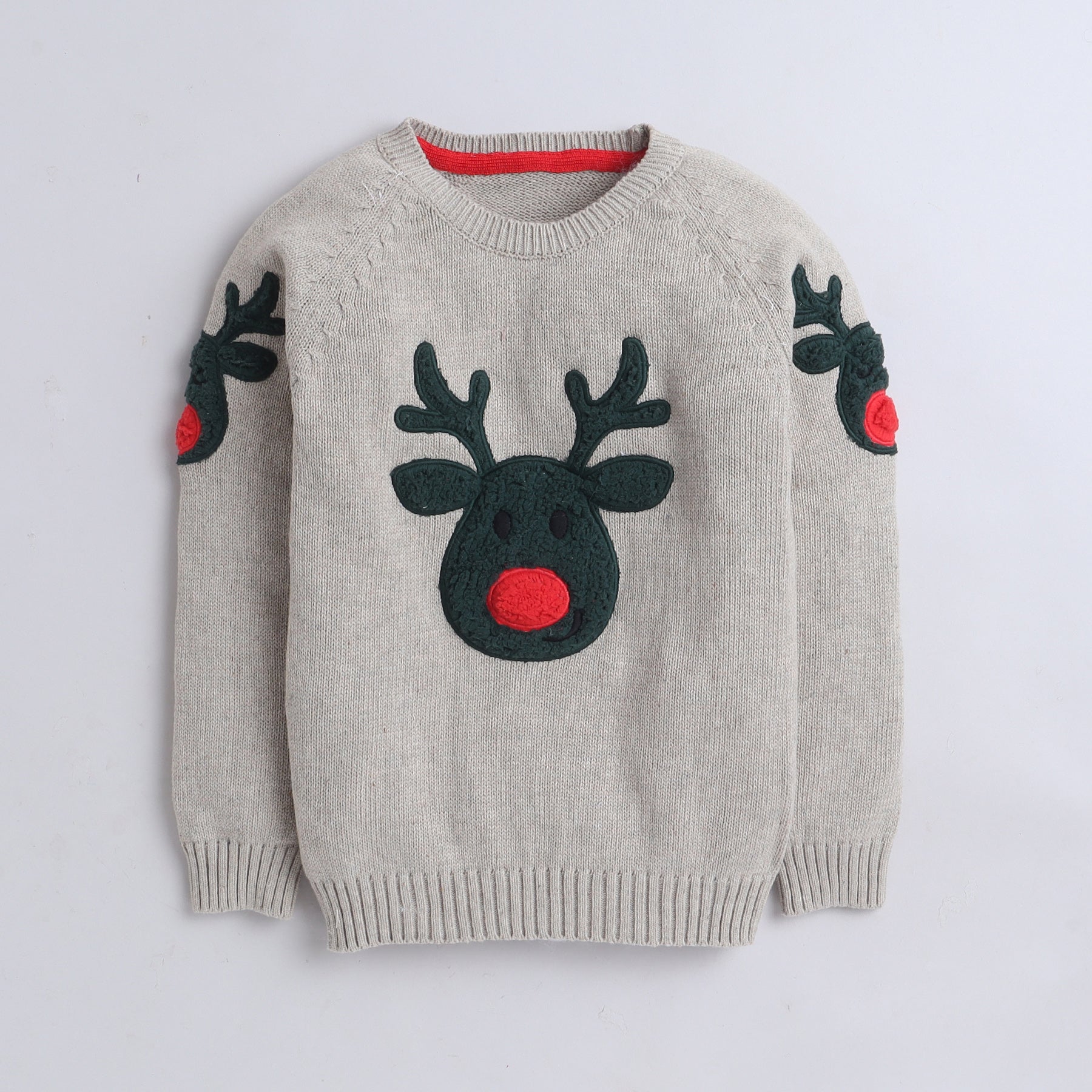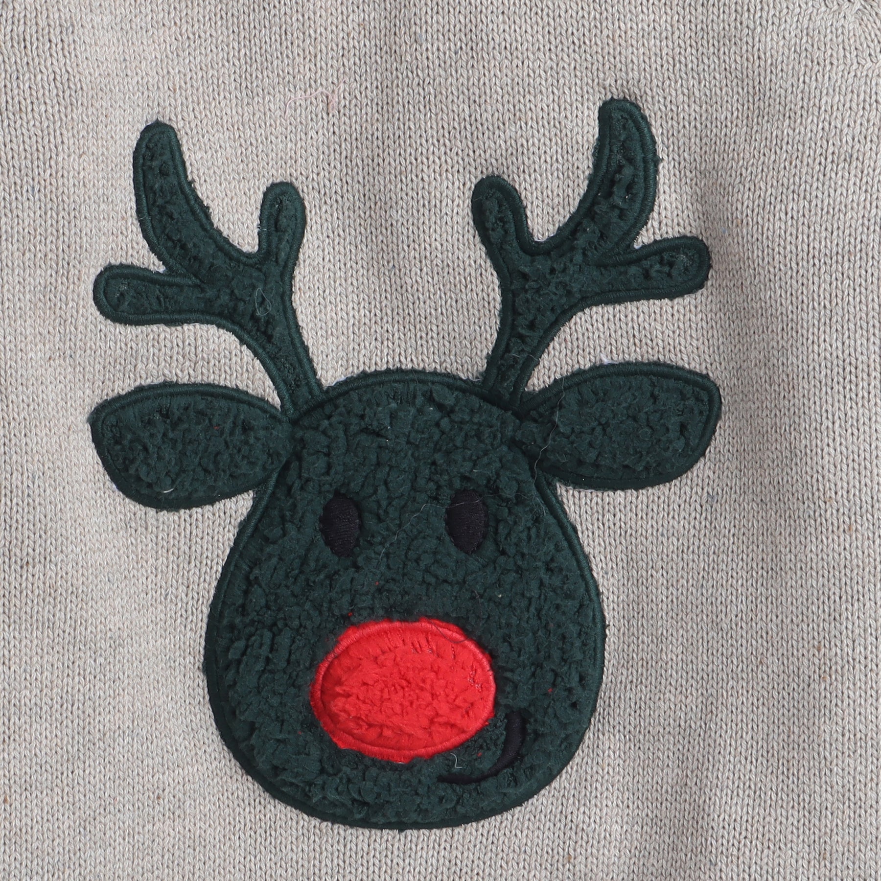 🦌 Adorable Reindeer Design – Features a charming reindeer face with 3D antlers and a bright red nose on the front and sleeves.